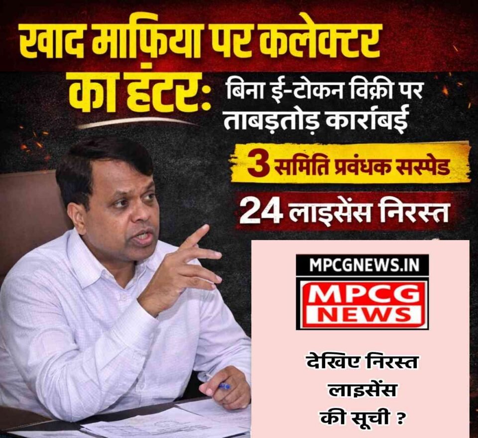 window.dataLayer = window.dataLayer || []; function gtag(){dataLayer.push(arguments);} gtag('js', new Date()); gtag('config', 'G-VQJRB3319M'); खाद माफिया पर कलेक्टर का हंटर: बिना ई-टोकन बिक्री पर ताबड़तोड़ कार्रवाई - MPCG News