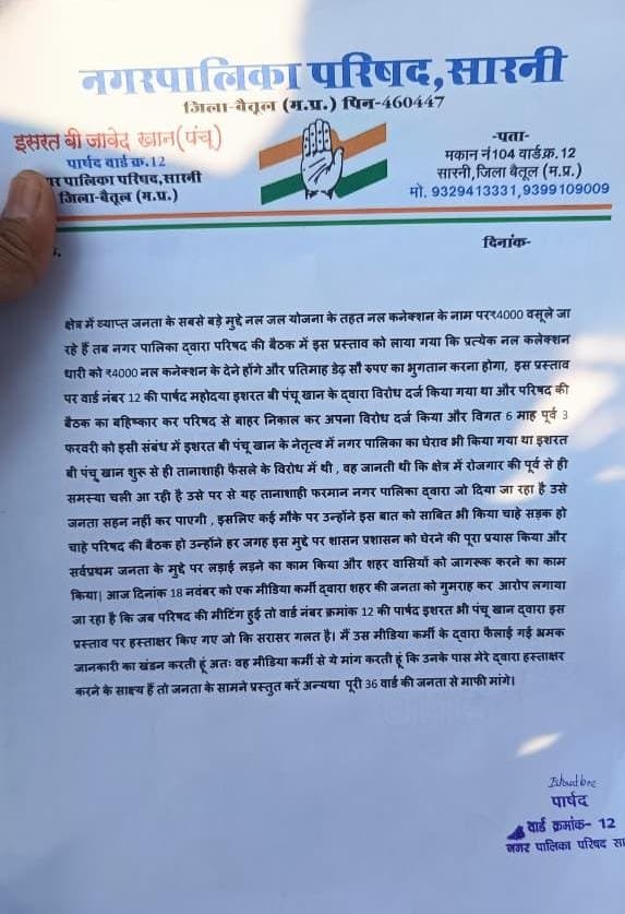 इशरत बी पंचू खान ने बताया कि 18 नवंबर को एक मीडिया कर्मी द्वारा यह आरोप लगाया गया कि परिषद की बैठक में उन्होंने विवादित प्रस्ताव पर हस्ताक्षर किए हैं। पार्षद ने इस दावे को पूरी तरह खारिज करते हुए कहा कि यह आरोप निराधार है और जनता को भ्रमित करने की कोशिश है।
