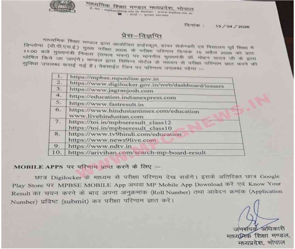 भोपाल। मध्यप्रदेश बोर्ड ने 10वीं और 12वीं परीक्षा के परिणामों को घोषित करने की तारीख का ऐलान कर दिया है। आधिकारिक डेट के जारी होने के बाद अब साफ हो चुका है कि एमपी बोर्ड 10वीं और 12वीं परीक्षाओं के रिजल्ट की घोषणा कब तक करेगा? समय के साथ तारीख का ऐलान भी कर दिया गया है। मध्य प्रदेश के मुख्यमंत्री डॉ। मोहन यादव ने खुद माध्यमिक शिक्षा बोर्ड की 10वीं और 12वीं की परीक्षा के परिणाम की तारीख को लेकर घोषणा की है। 10वीं-12वीं बोर्ड परीक्षा की घोषणा 15 अप्रैल 2026 को की जाएगी। परीक्षा में शामिल स्टूडेंट्स सरल तरीके को अपनाकर एमपी बोर्ड रिजल्ट चेक कर सकते हैं। एमपी बोर्ड 10वीं और 12वीं का रिजल्ट 15 अप्रैल को कितने बजे घोषित किया जाएगा ? कहां-कहां एमपी बोर्ड रिजल्ट चेक कर सकते हैं और कैसे 10वीं-12वीं की मार्कशीट डाउनलोड कर सकते है ? आइए जानते हैं।